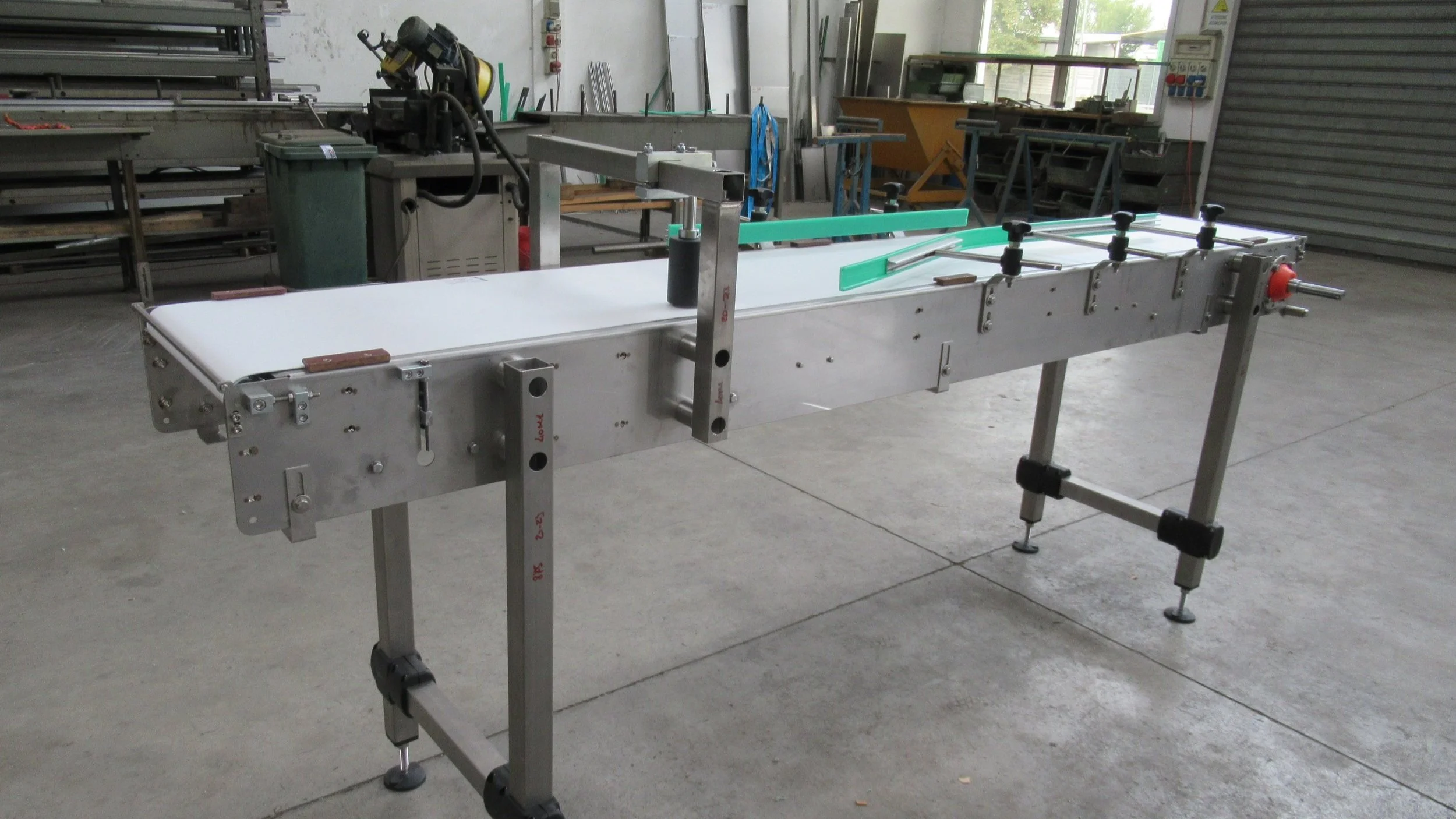 Struttura in acciaio inox 304. Piedi di sostegno con basi in materiale plastico regolabili in altezza o su ruote. Sponde di contenimento create in base al prodotto. Protezioni antinfortunistiche su ogni nastro con carter e canaline raccogli liquidi.